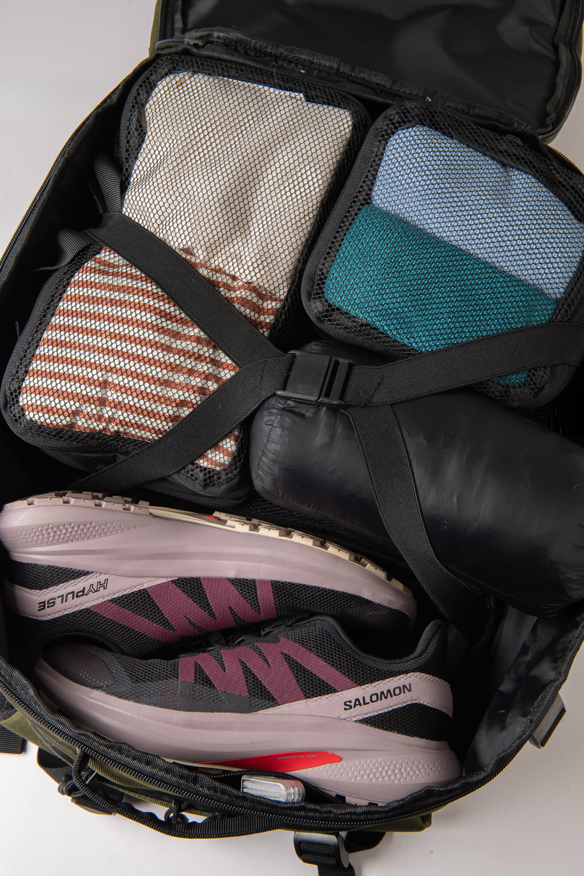 Mochila de viaje con doble apertura completa que permite acceder a todo el contenido sin necesidad de desordenar el interior.